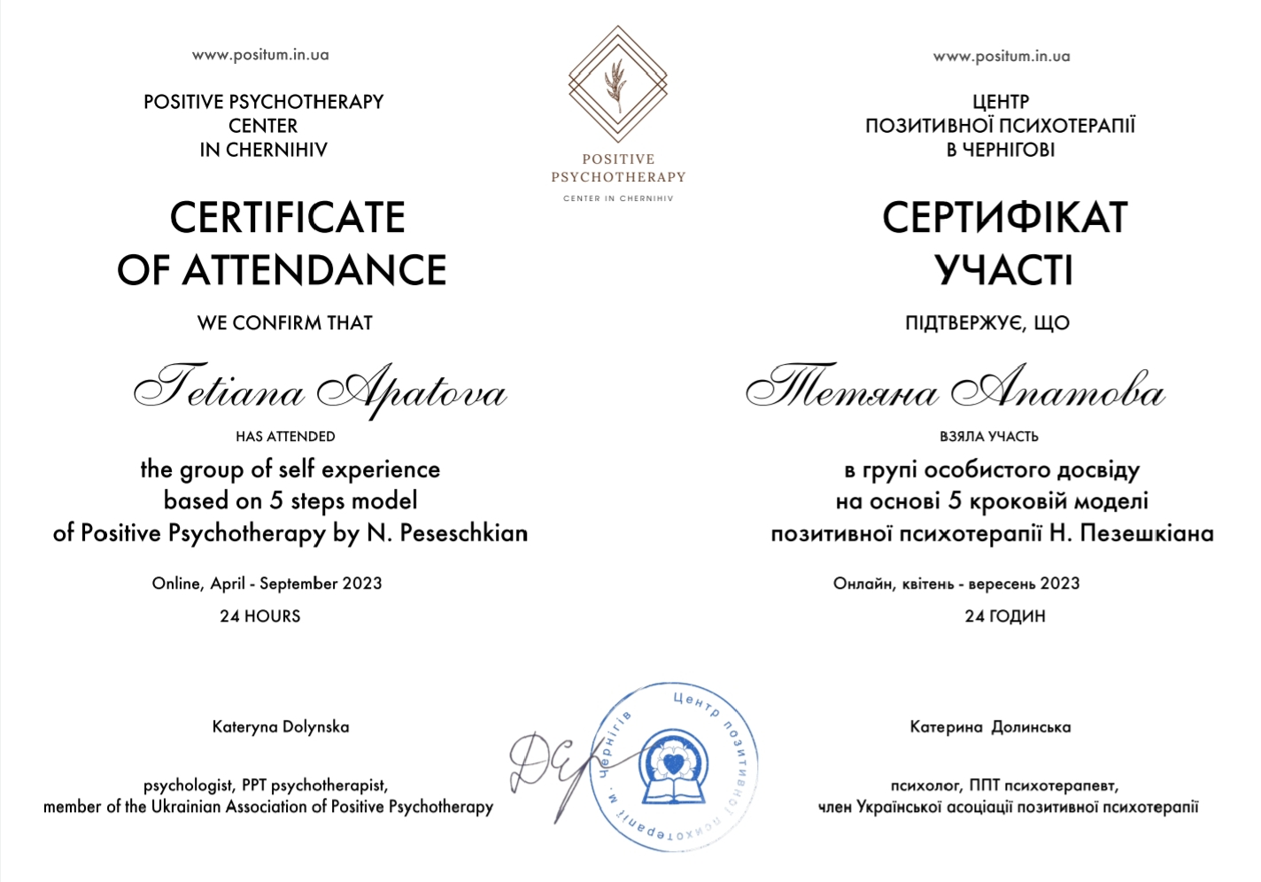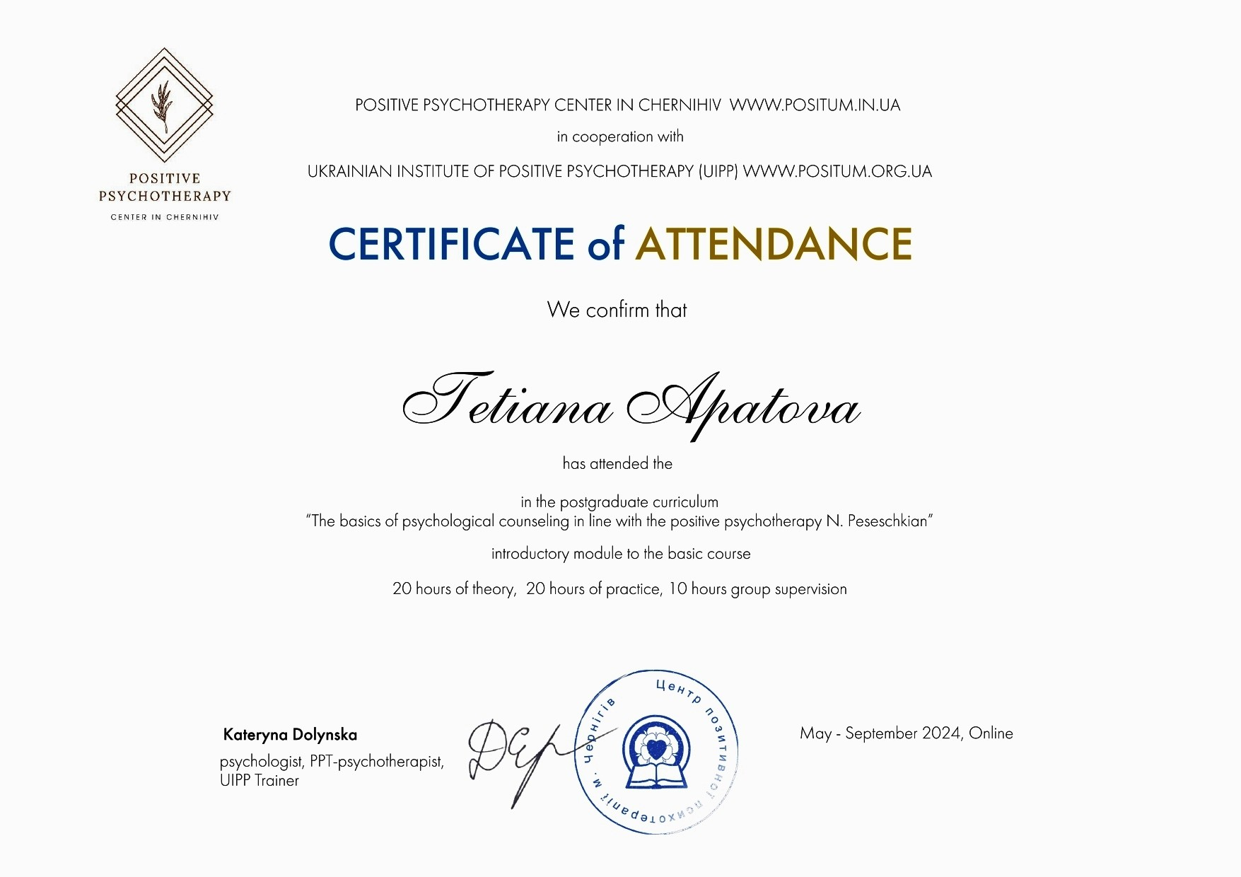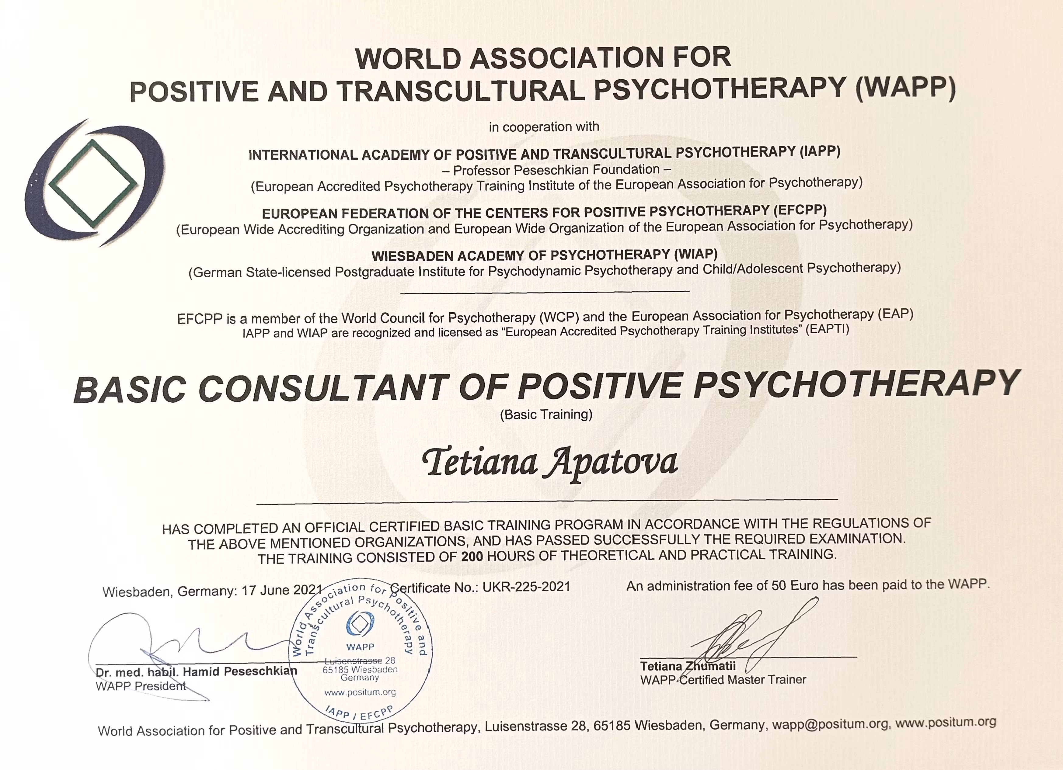 В роботі, на своїх консультаціях я використовую міжнародно визнаний метод короткострокової психодинамічної психотерапії та консультування - позитивна транскультуральна психотерапія (ППТ) Н. Пезешкіана. Він був заснований у 1968 році та інтегрує гуманістичні, системні та когнітивно-поведінкові підходи, орієнтуючись на ресурси та можливості людини, а не лише на її симптоми.