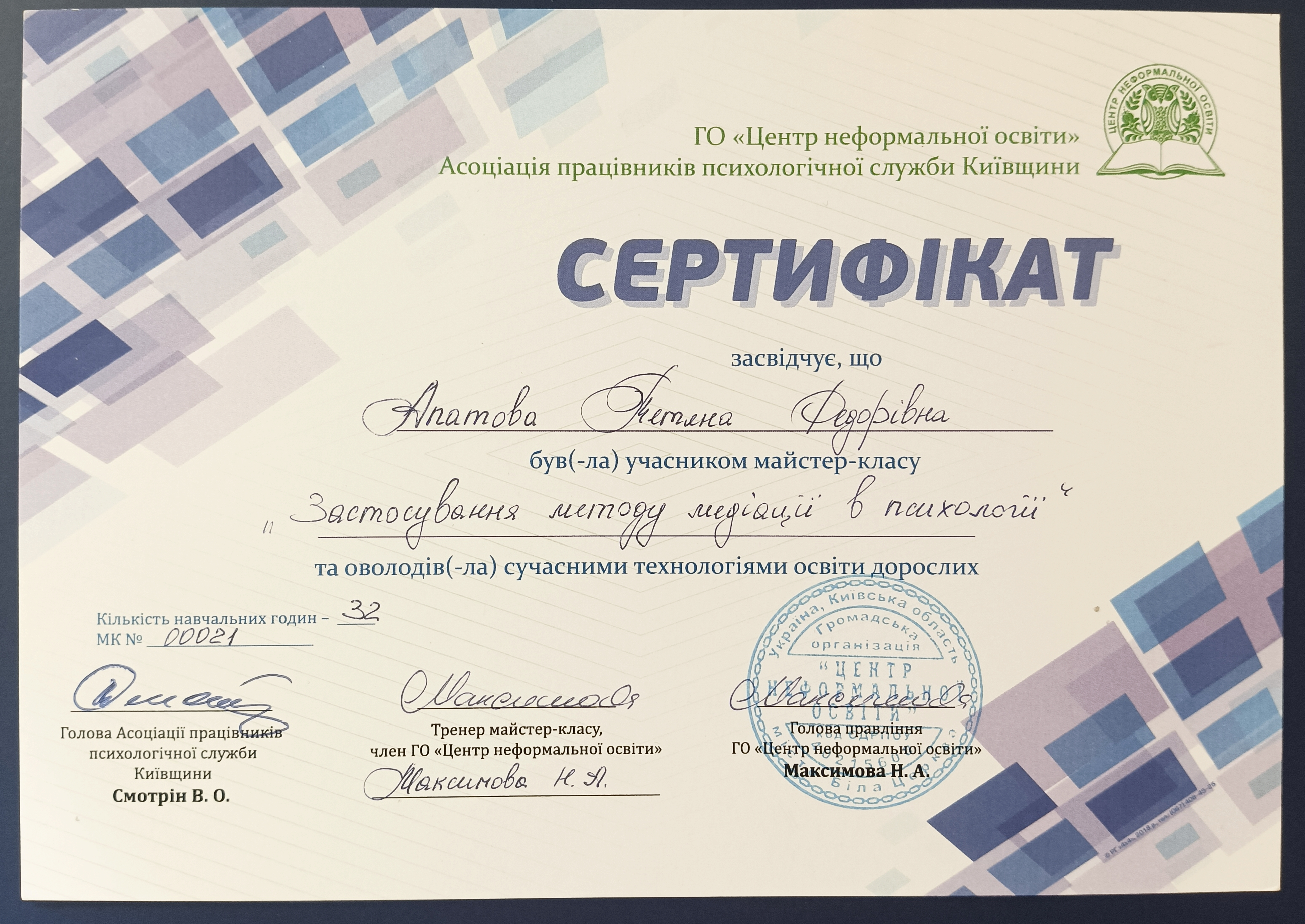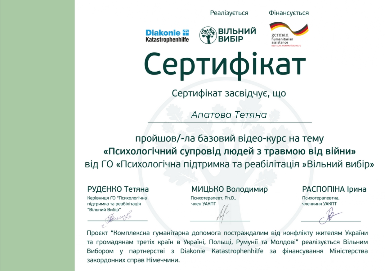 Працюю дбайливо, з повагою до Вас і Вашого життєвого досвіду.