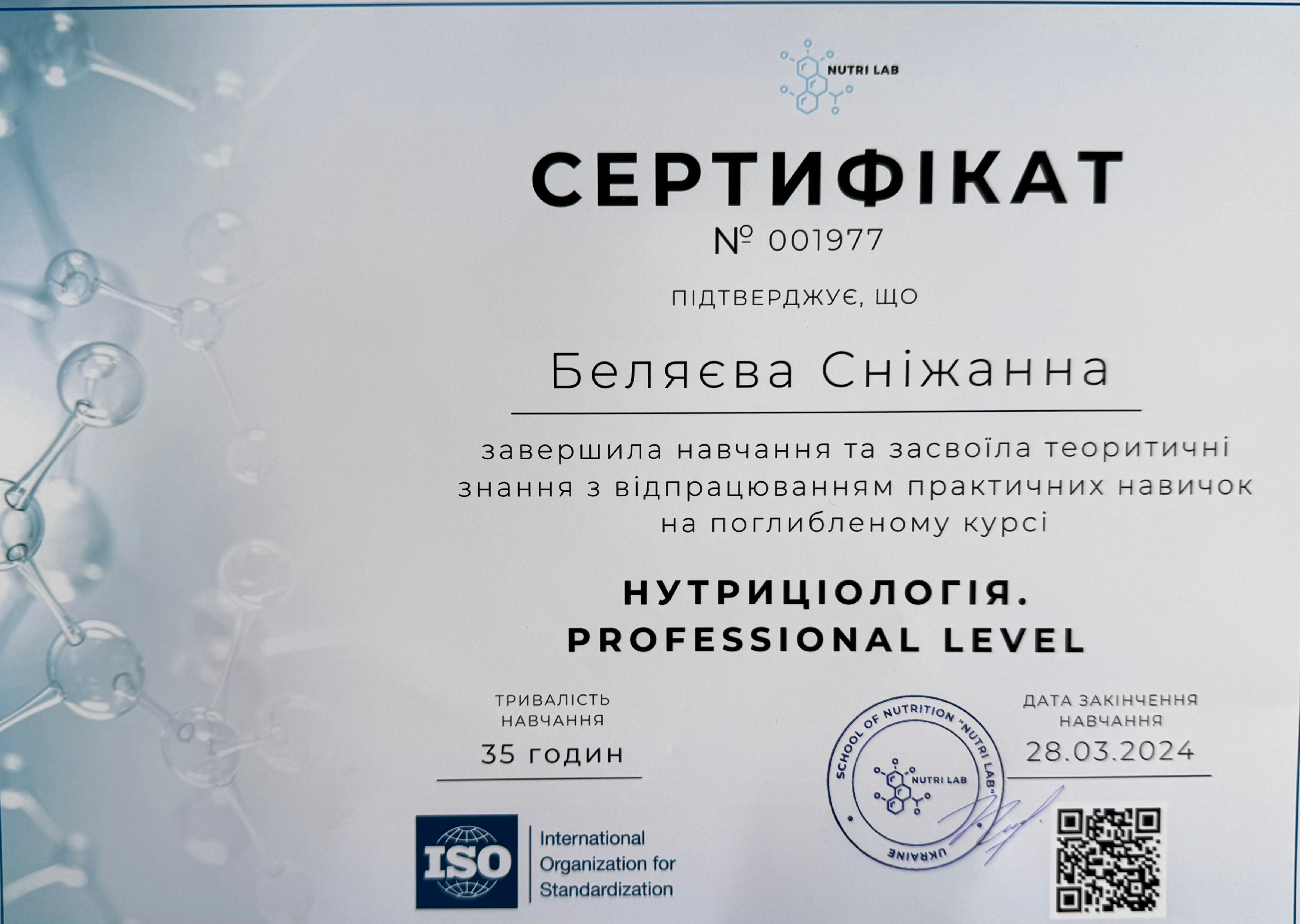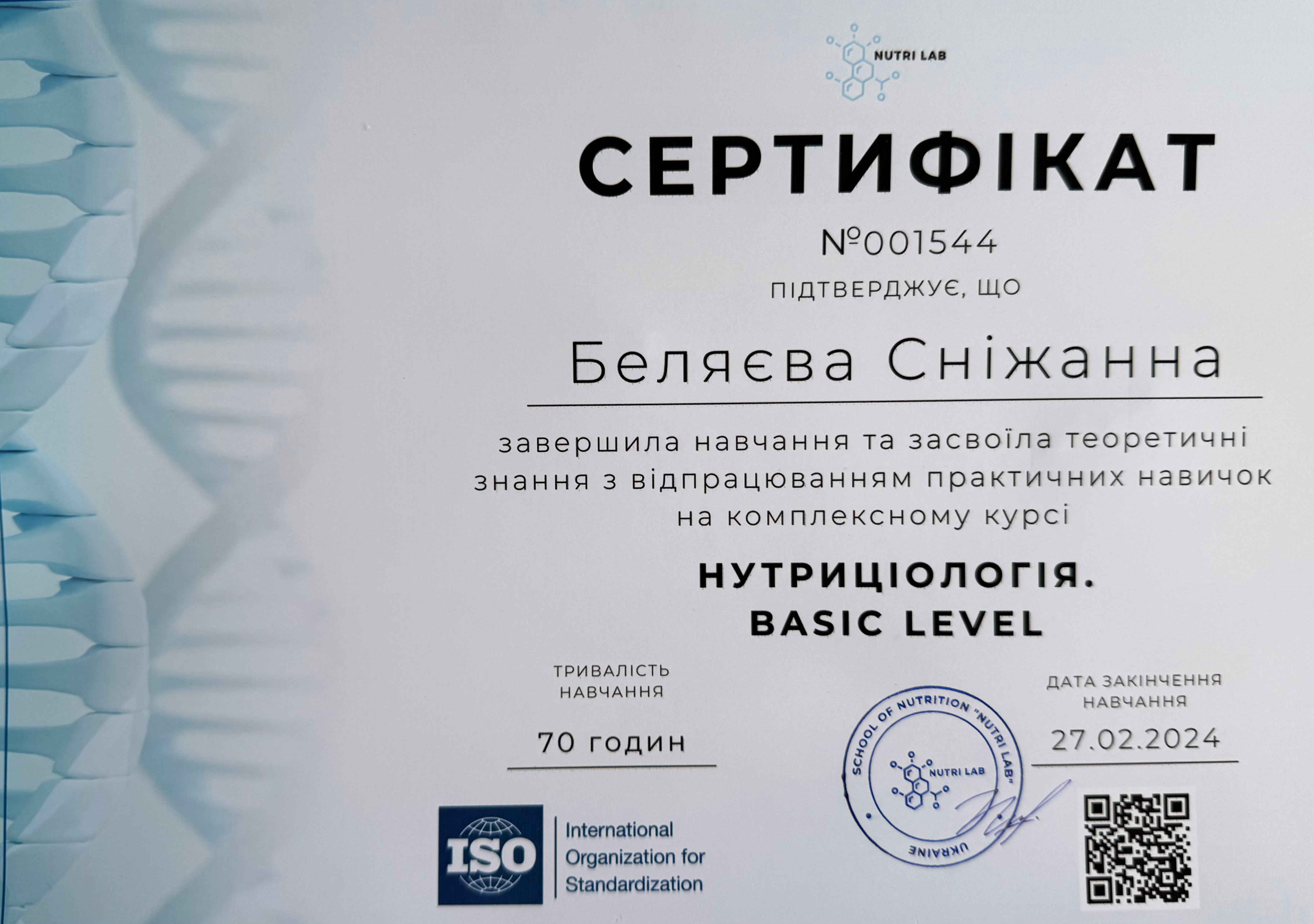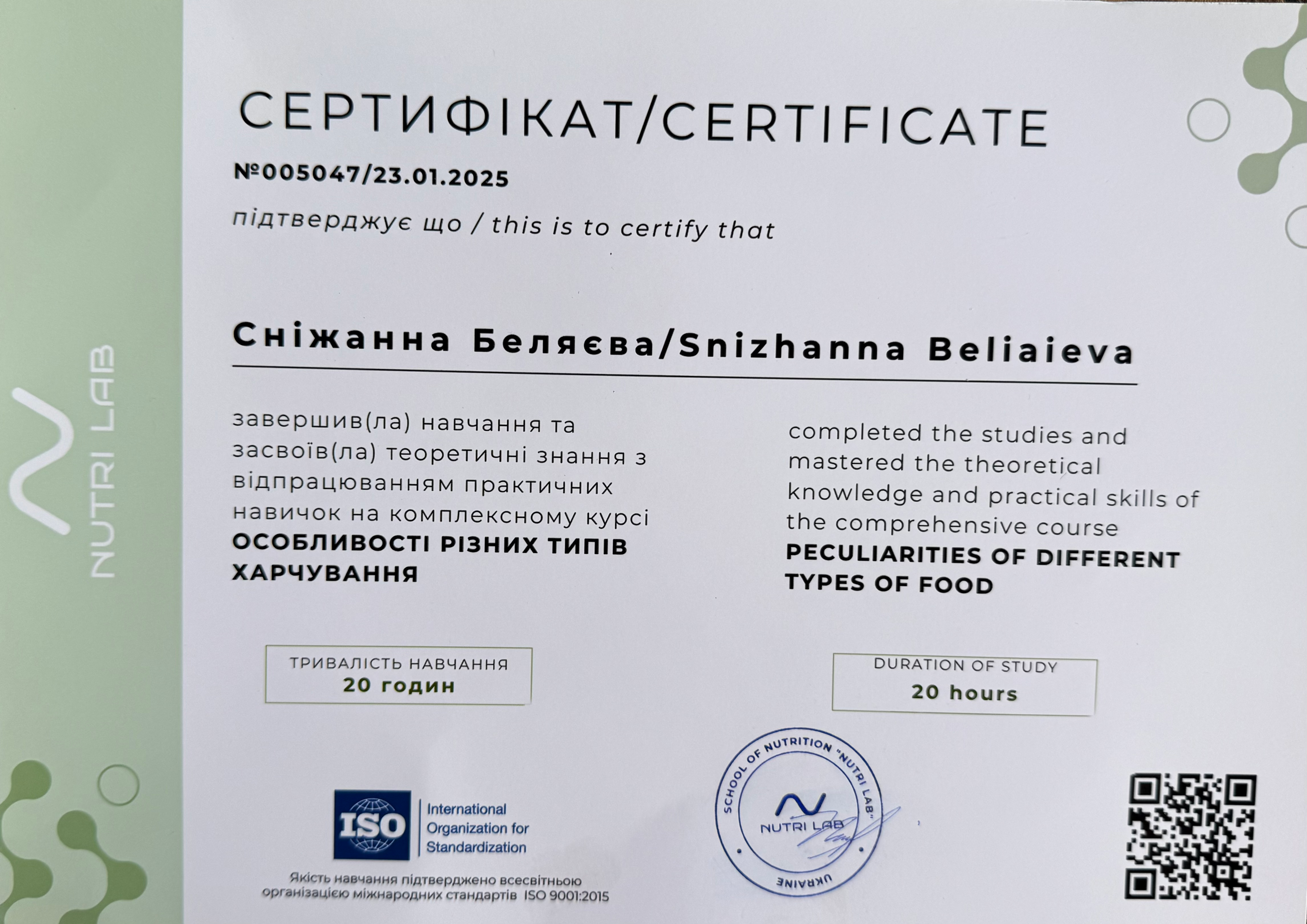 Привіт! Мене звати Сніжанна, я - сертифікована практикуюча нутриціологиня. Працюю з харчуванням як інструментом відновлення фізичного та емоційного стану. Допомагаю людям краще зрозуміти своє тіло, налагодити харчові звички та позбутися симптомів, які заважають жити якісно: втому, набряки, проблеми зі шкірою, апетитом, травленням чи вагою.