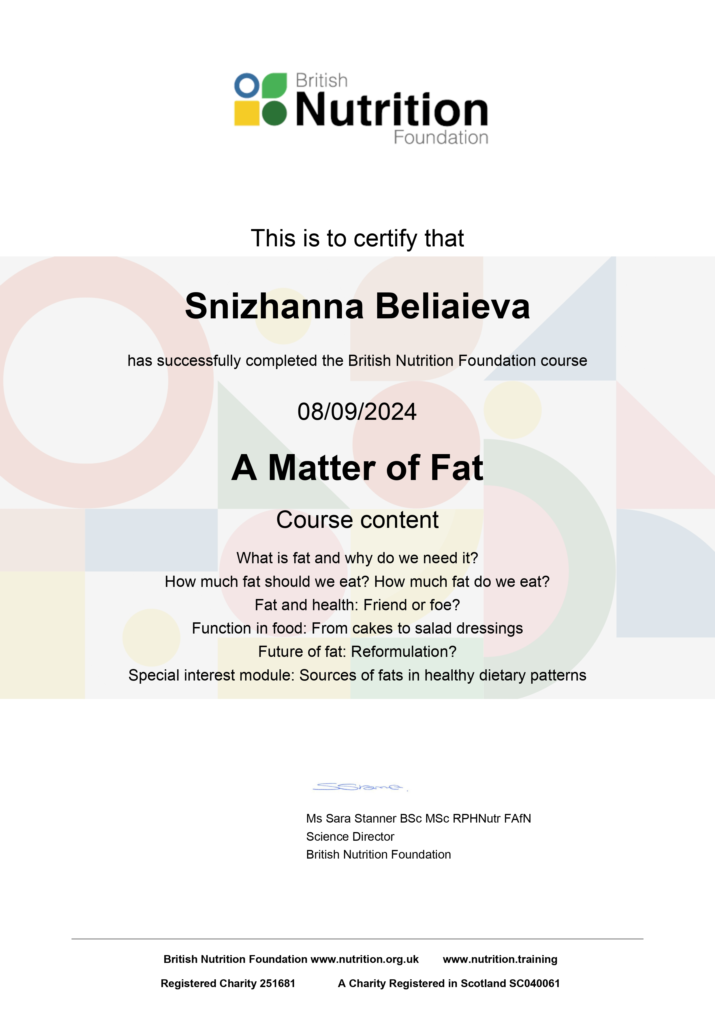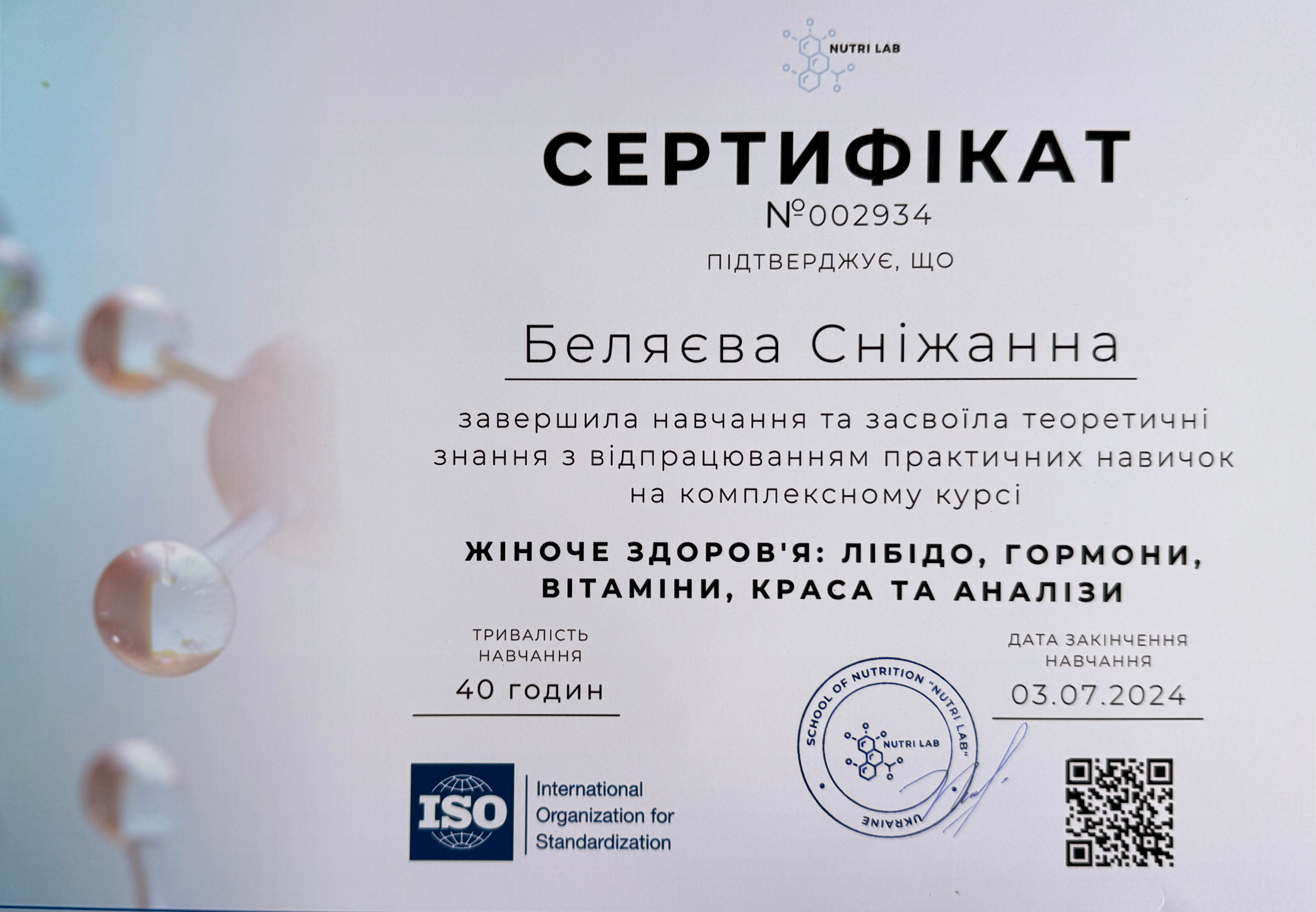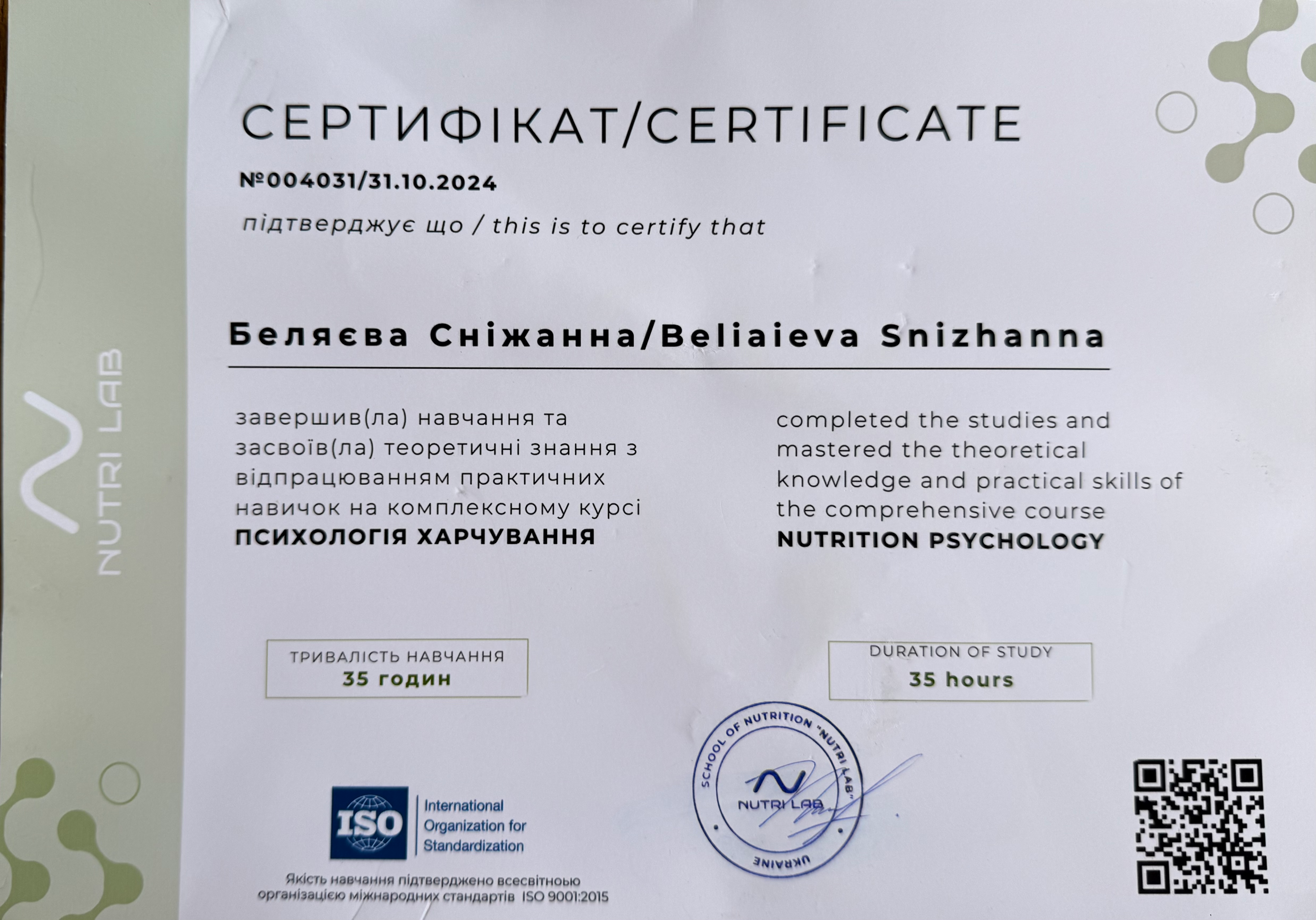 Привіт! Мене звати Сніжанна, я - сертифікована практикуюча нутриціологиня. Працюю з харчуванням як інструментом відновлення фізичного та емоційного стану. Допомагаю людям краще зрозуміти своє тіло, налагодити харчові звички та позбутися симптомів, які заважають жити якісно: втому, набряки, проблеми зі шкірою, апетитом, травленням чи вагою.