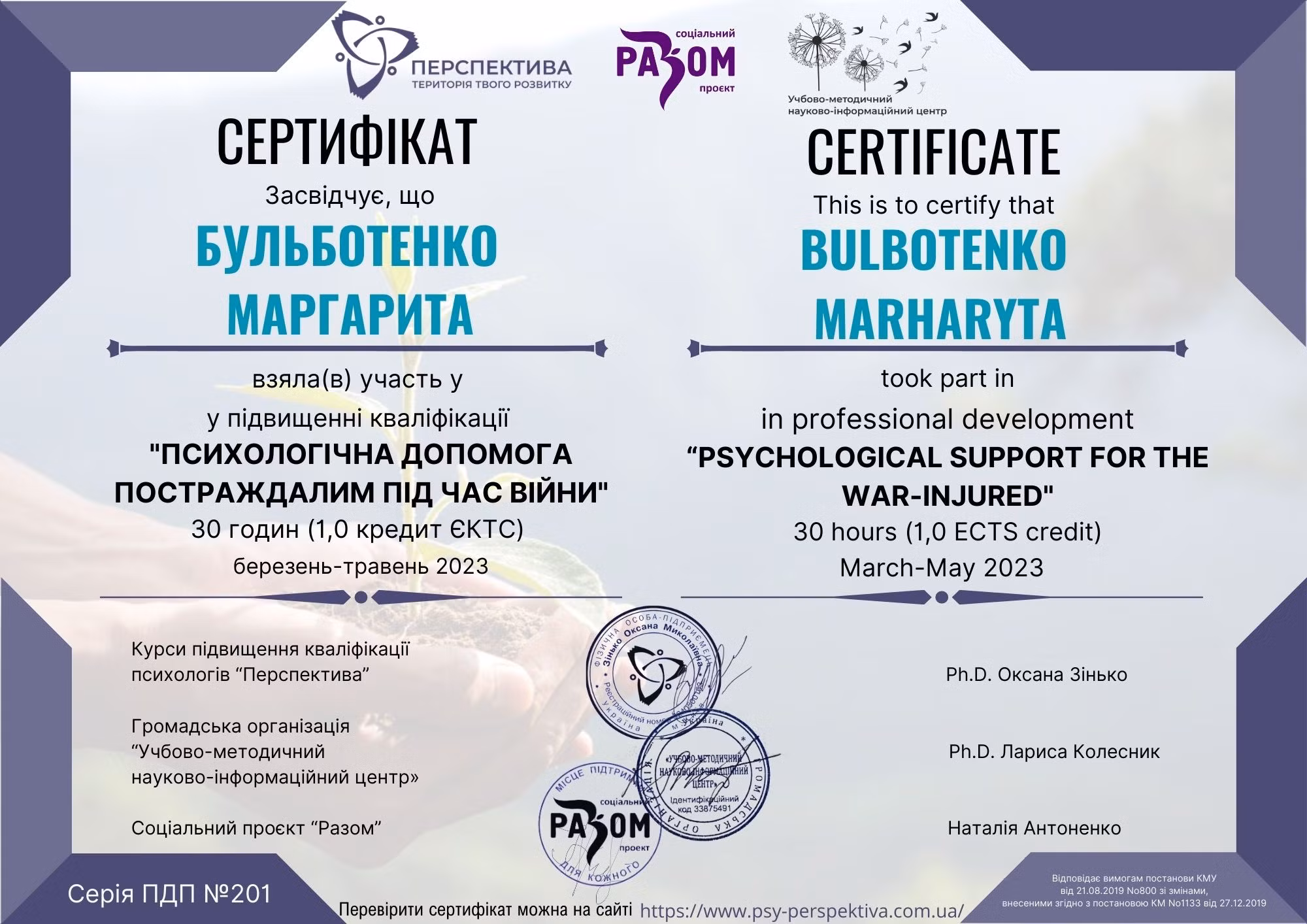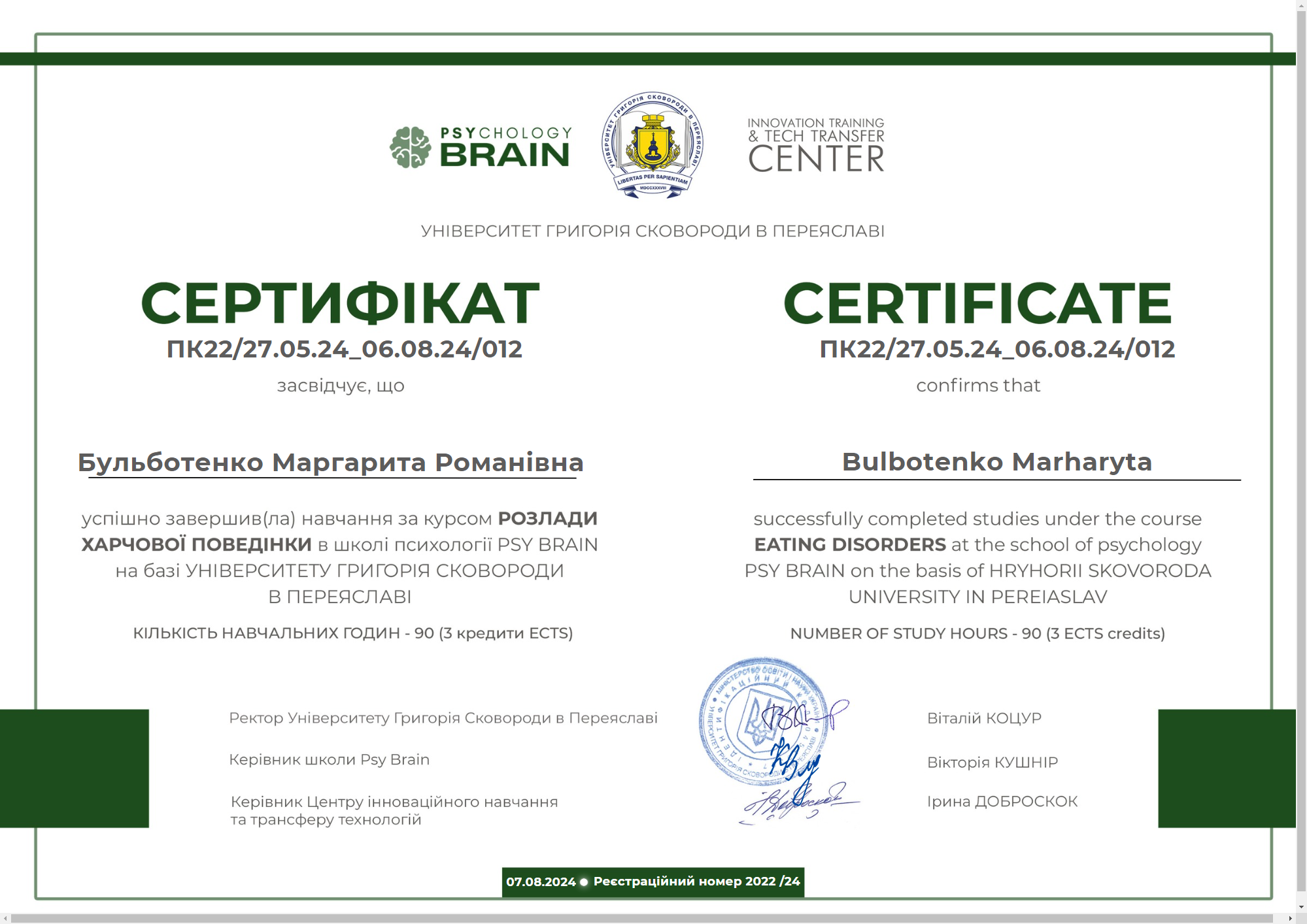 У психологію я прийшла у 17 років, коли особистий досвід терапії допоміг вперше по-справжньому почути себе. Відтоді постійно навчаюся й розширюю напрямки: від роботи з тілесними проявами емоцій (психосоматика) до дослідження інтимності, меж та близькості (сексологія).