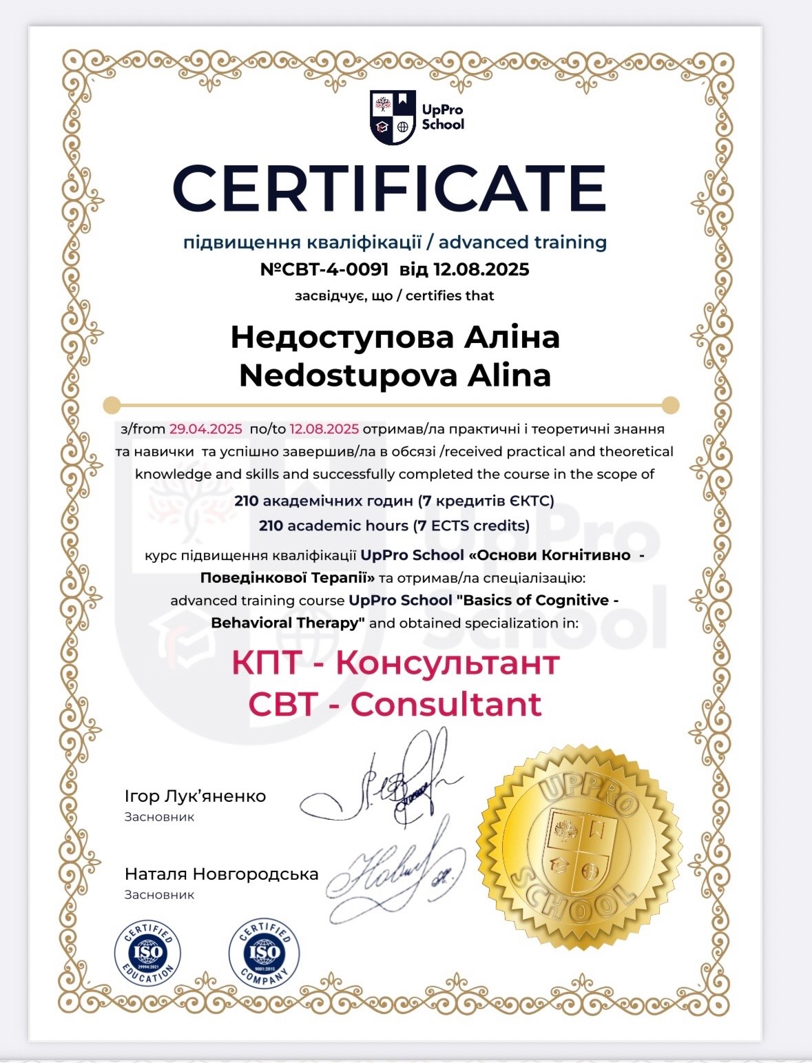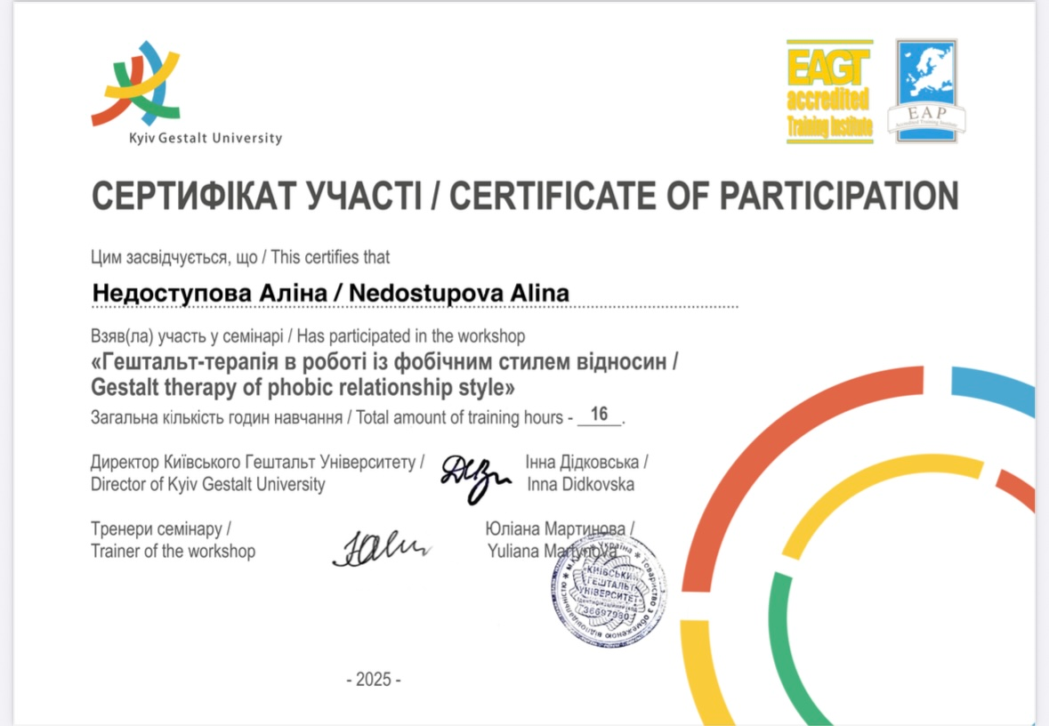 Вітаю . Я-Аліна , гештальт-терапевтка,КПТ-консультантка та психологиня. Маю 350+ годин особистої терапії та регулярну супервізію.
