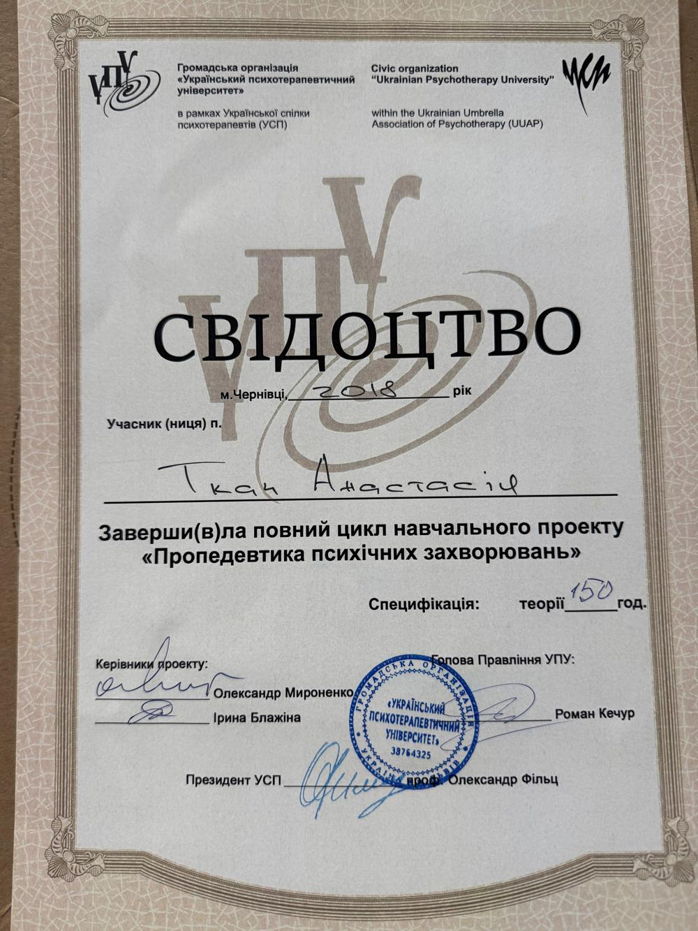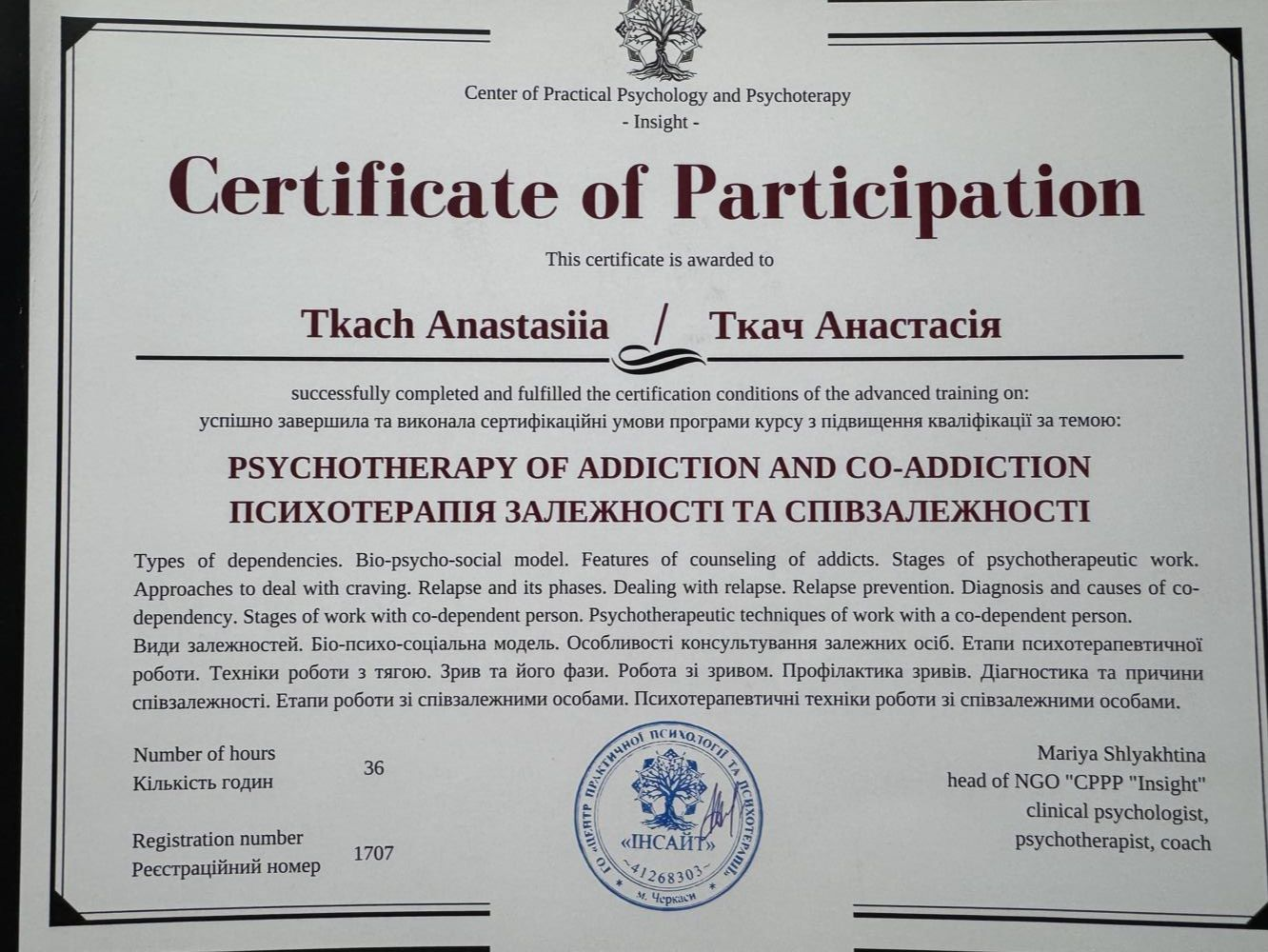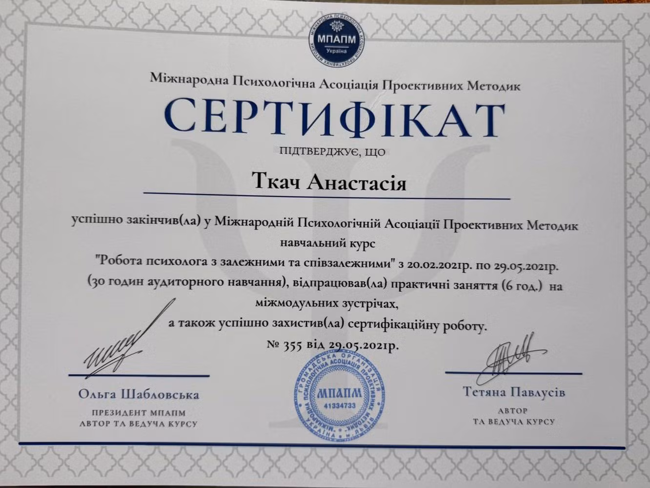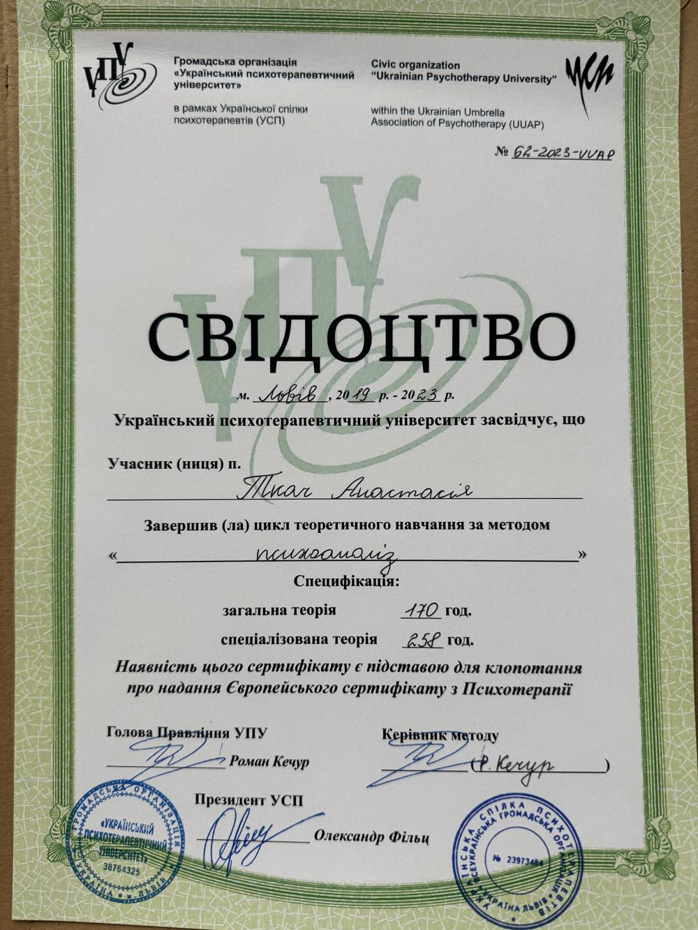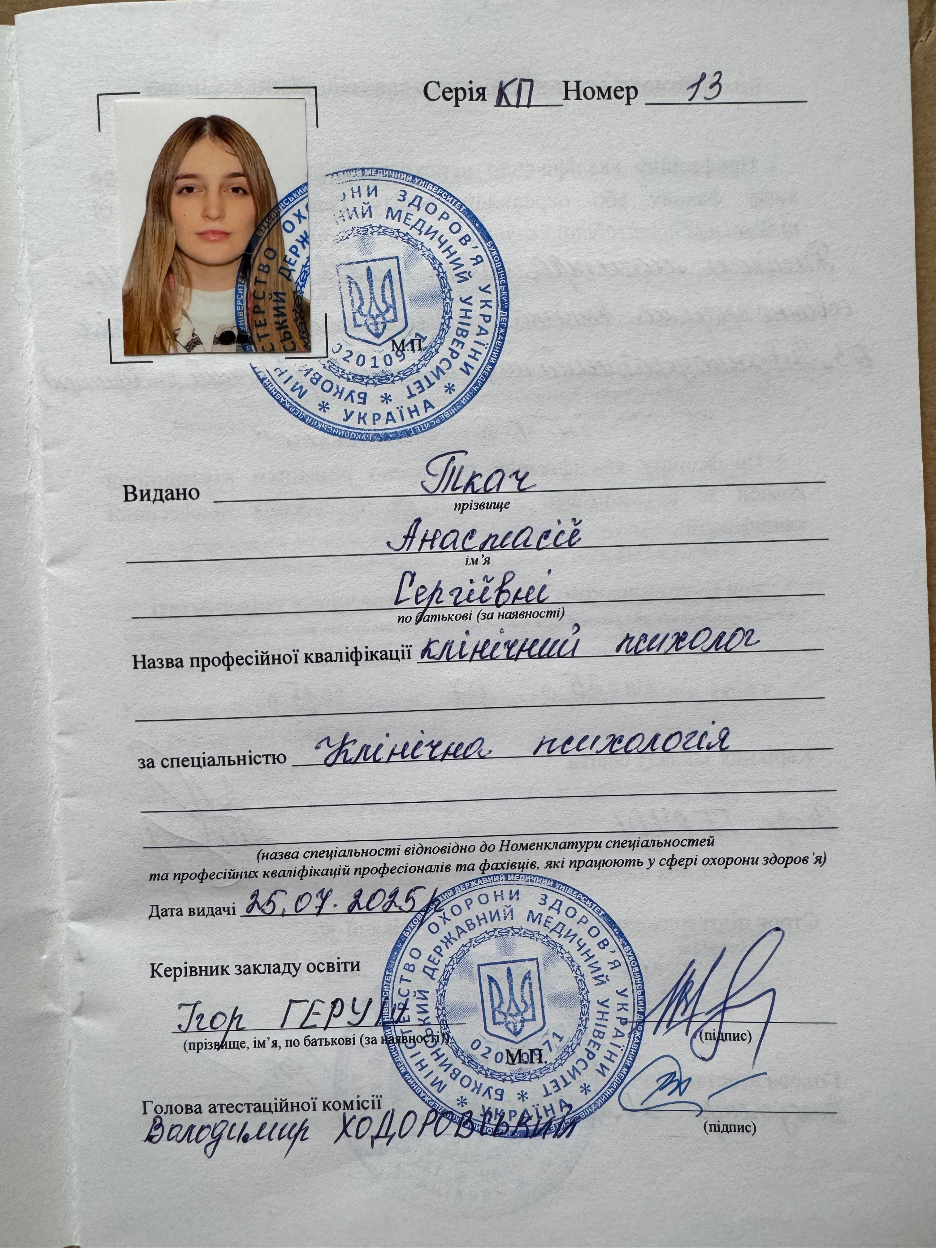 Я є членкинею УСП, НПА та спільноти EMDR. Постійно навчаюся, проходжу супервізії та маю досвід власної й групової терапії. Це робить мою роботу глибшою та більш чутливою до вашої історії.