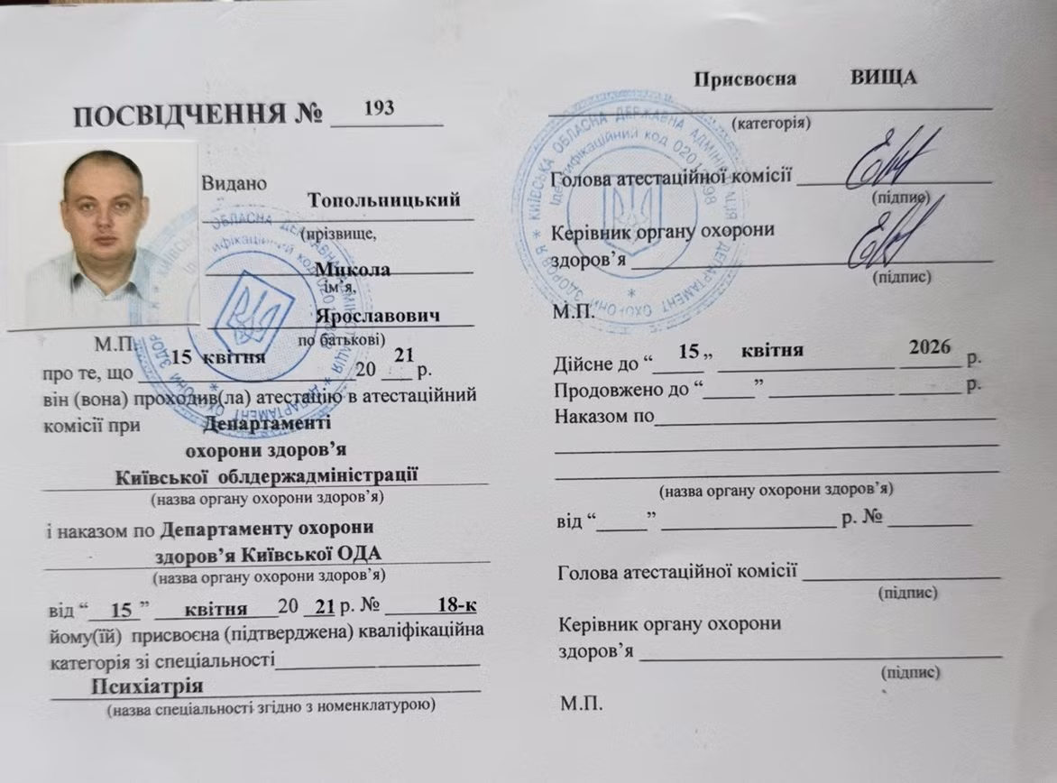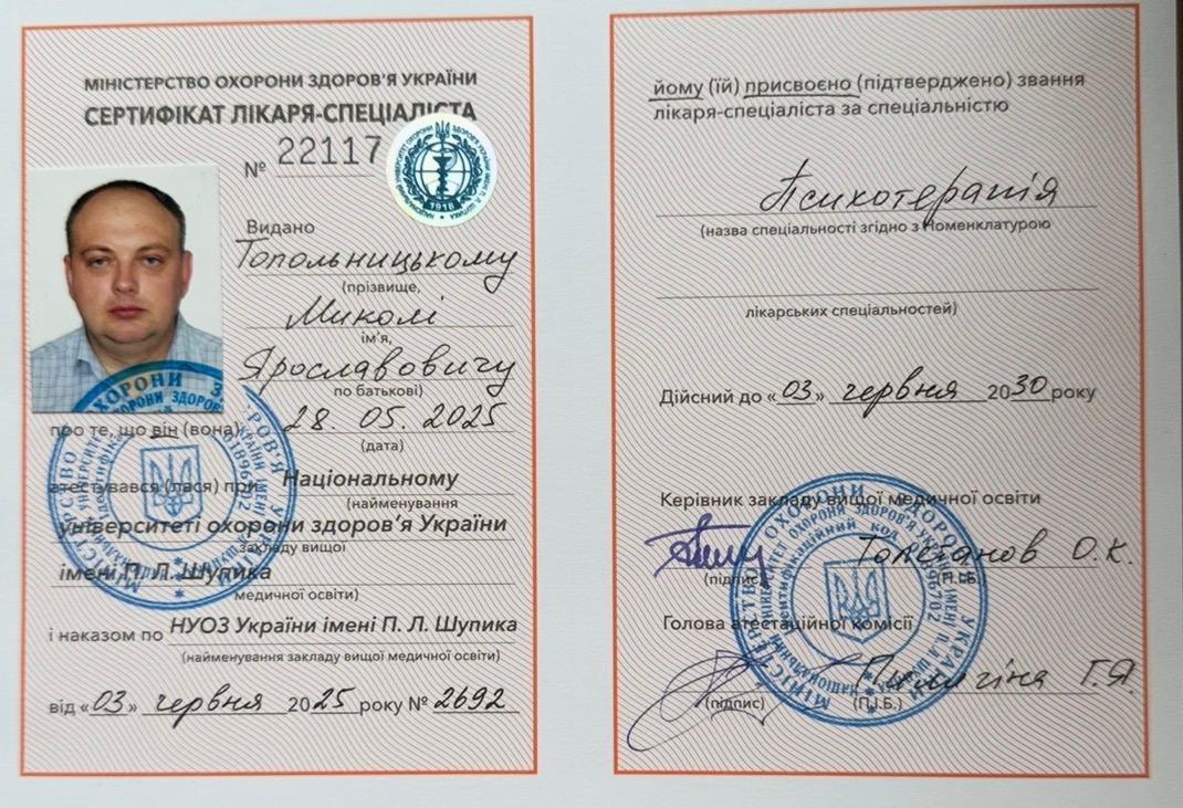 Мене звати Микола Ярославович, я практикуючий лікар психіатр вищої категорії, лікар психотерапевт. Досвід роботи в психіатрії 15 років.