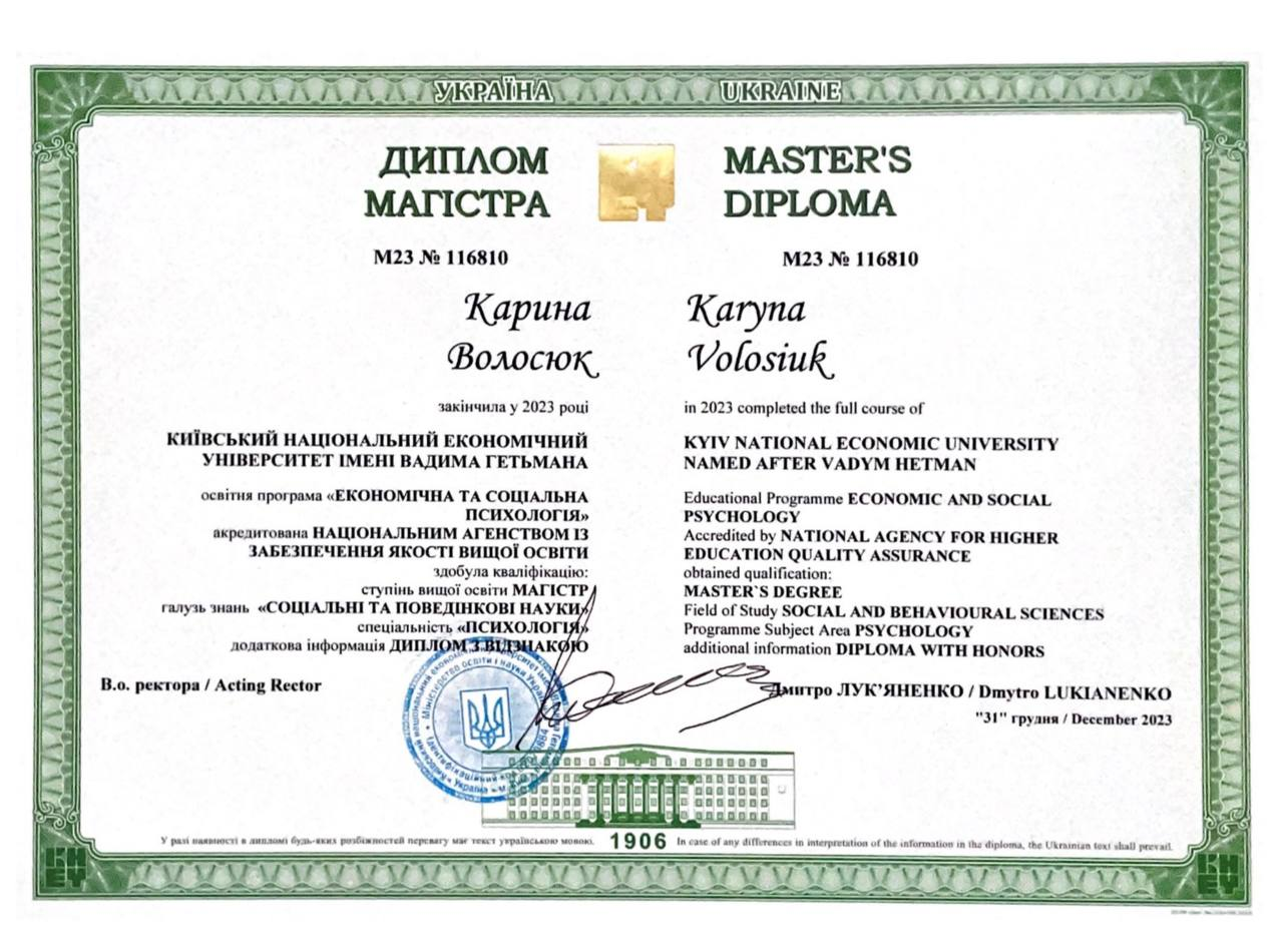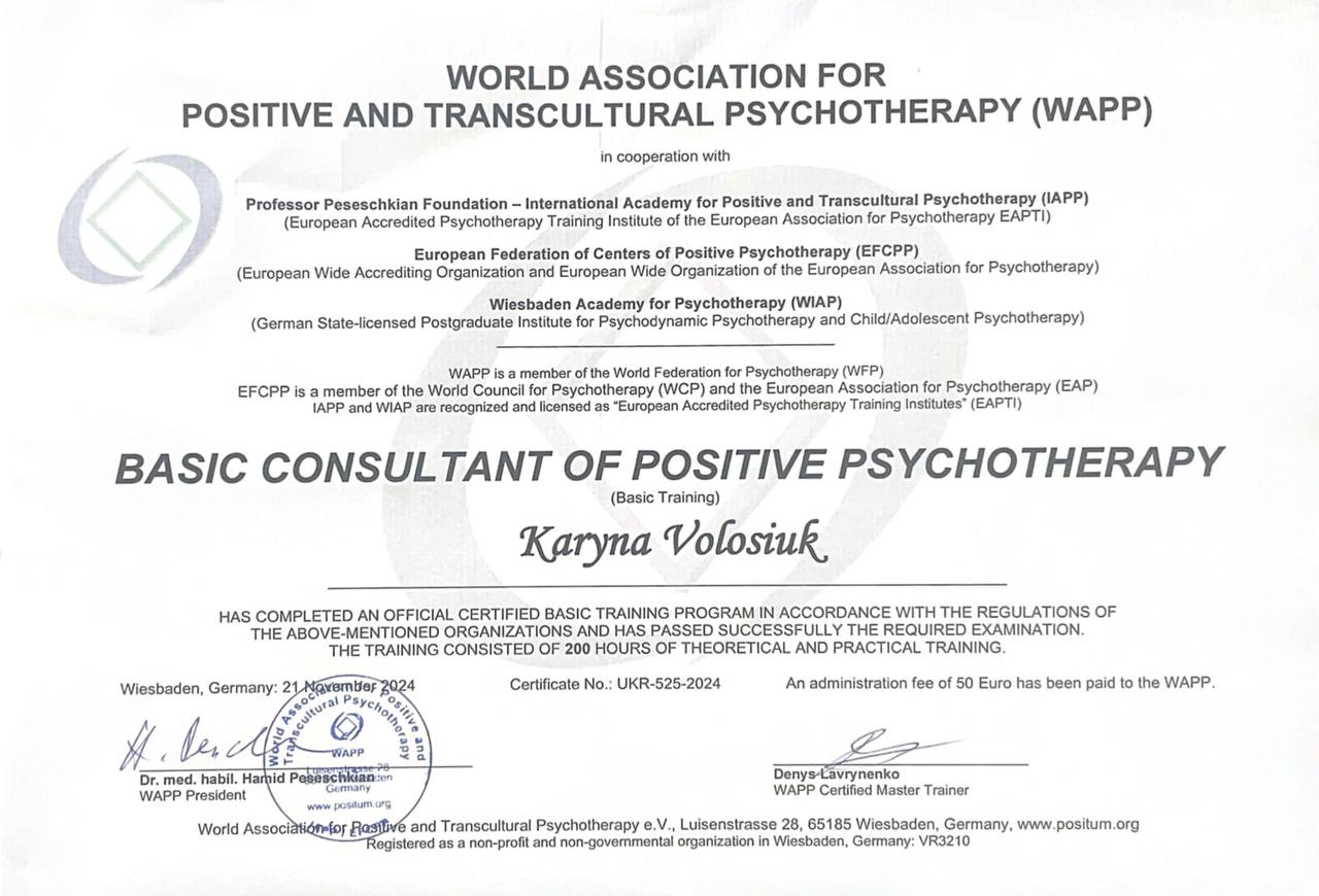 Мене звати Карина. Я психолог-консультант в методі позитивної психотерапії, член Української спілки психотерапевтів (УСП) та Української асоціації позитивної психотерапії (УАПП). Метод позитивної психотерапії — це сучасний напрям, який поєднує глибину розуміння людини з практичним і ресурсним підходом до вирішення життєвих труднощів. Я допомагаю клієнтам краще розуміти свої внутрішні конфлікти, знаходити причини повторюваних ситуацій у житті, зміцнювати опору на себе та будувати нове ставлення до себе й інших. У своїй практиці я надаю особливе значення довірі, щирості та якісному контакту з клієнтом. Для мене терапія — це безпечний простір, де людина може бути собою, говорити про важливе й отримувати підтримку. Вірю, що кожен здатен змінити своє життя на краще — варто лише зробити перший крок.