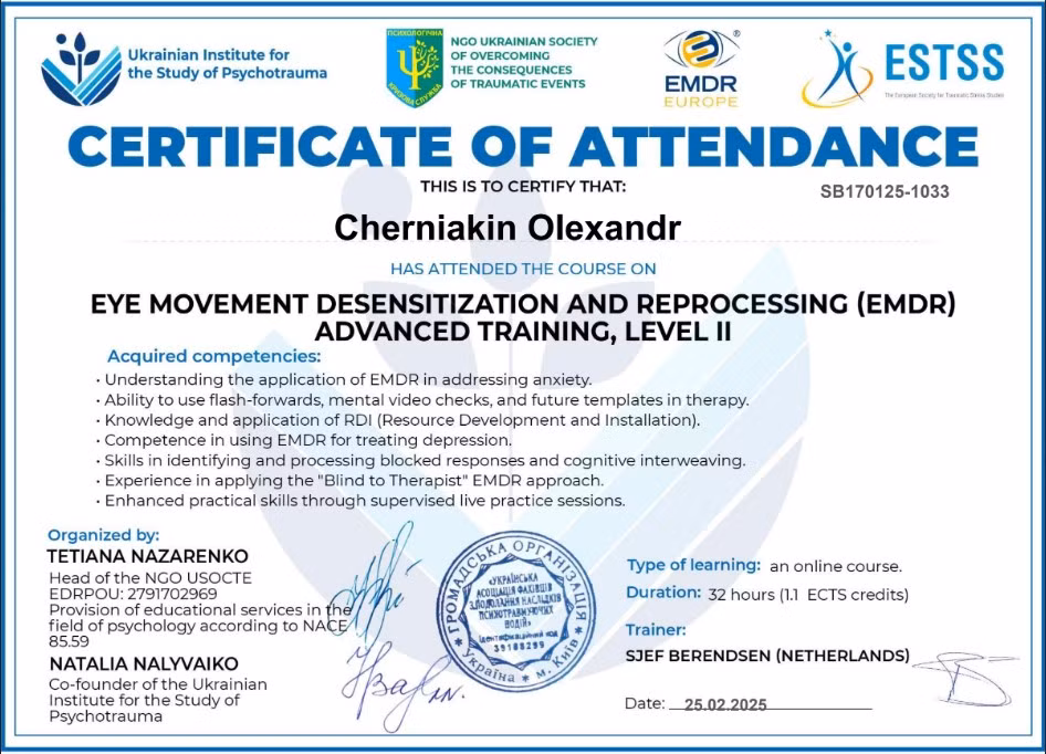 Разом з Вами ми зможемо зрозуміти причини, відчути і пережити травматичний досвід в безпечний спосіб для того, щоб відпустити і наповнитись новими ресурсами, знайти опори і сенси, щоб знову вдихнути легкість і спокій.