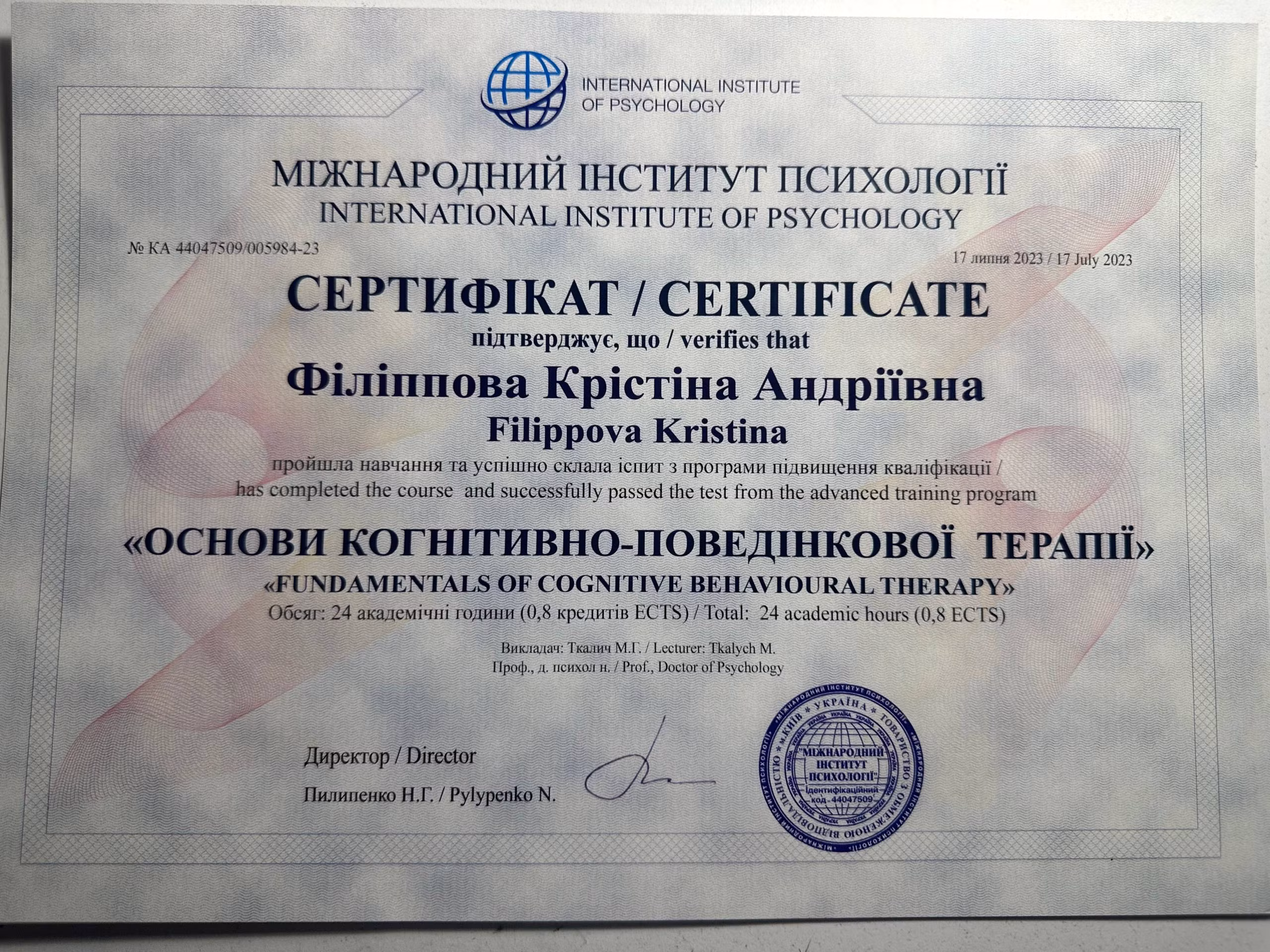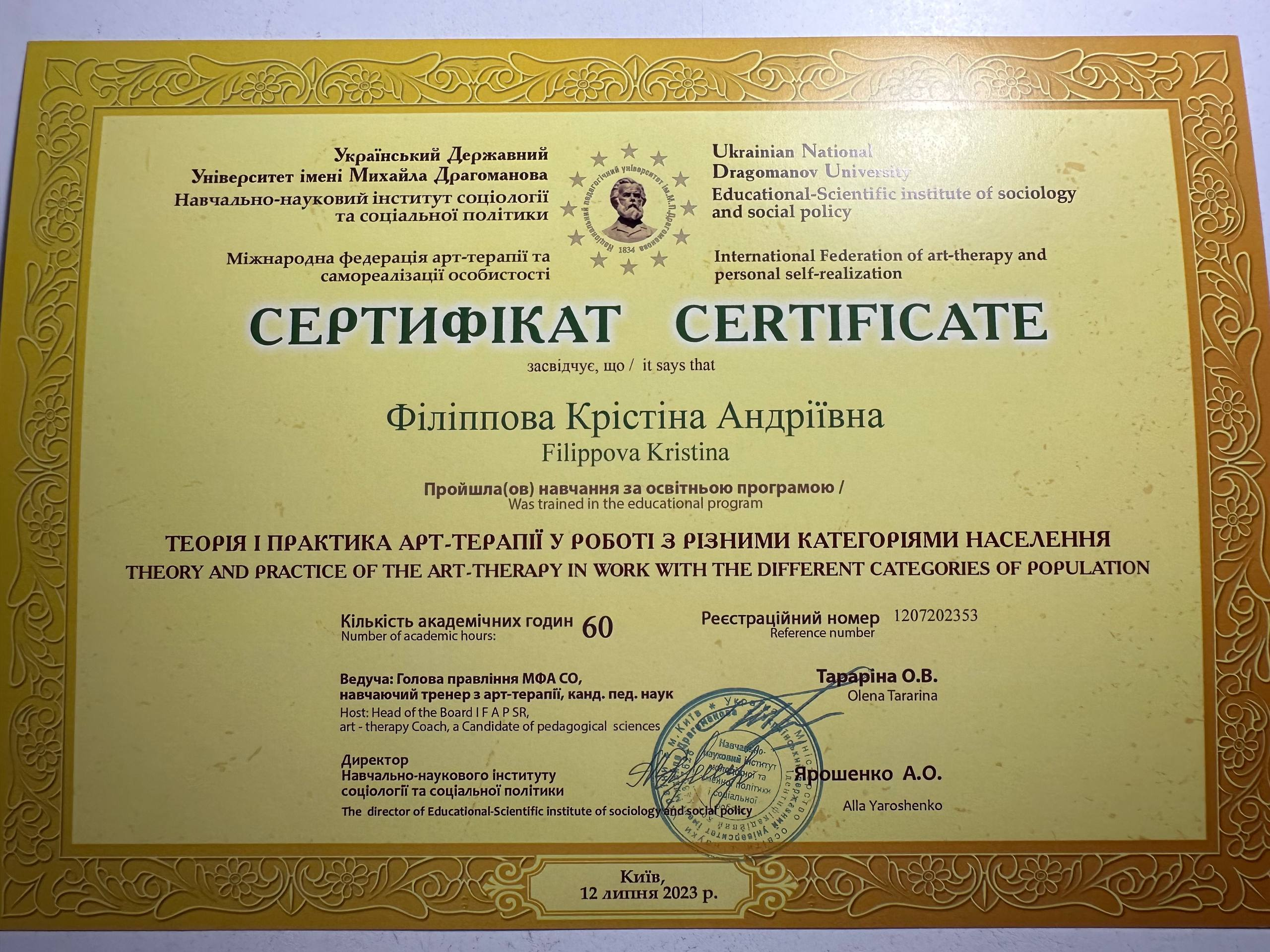 Я проходжу постійне навчання. У методах КПТ, Арт-терапії, Символдрама,пропедевтика психіатрії поглиблено вивчаю Логотерапію. Пройшла підвищення кваліфікації для роботи з військовими та їхніми сім’ями. Працюю з різною категорією людей. За час моєї практики працювала з різними запитами.