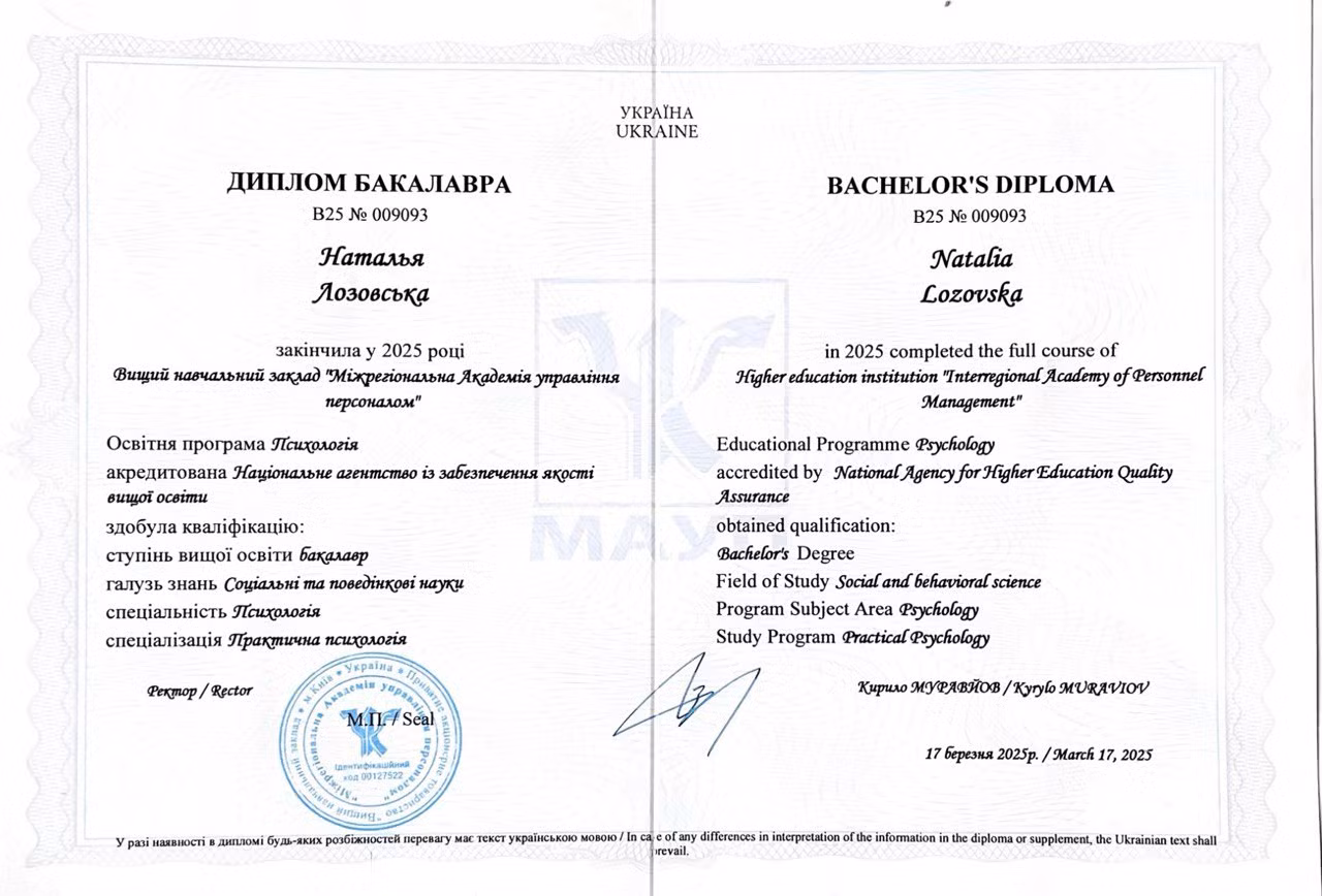 Я имею высшее психологическое образование. За годы практики прошла ряд специализированных курсов и обучающих программ, которые сформировали мою профессиональную базу. В своей работе я придерживаюсь интегративного подхода, опираясь на системное мышление и целостное видение человека.