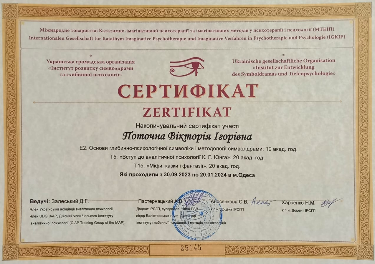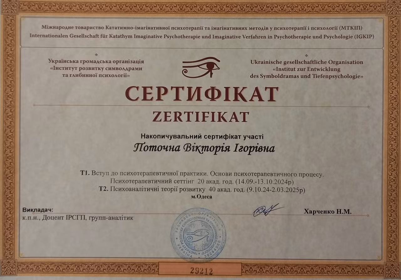Вітаю! Мене звати Вікторія. Я психотерапевт, працюю в методі символдрами — через образи допомагаю м’яко торкатися внутрішнього світу, знаходити розуміння, підтримку й ресурс для змін.